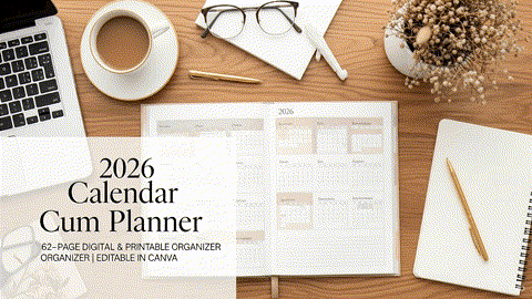 2026 Calendar Cum Planner | 62-Page Printable & Digital Planner | Customizable Canva Template